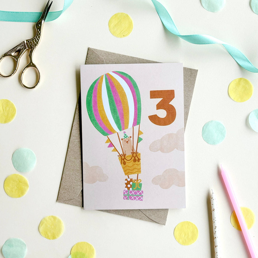 Age 3 Bear Birthday Card - Kids Cute 3rd Milestone Balloon