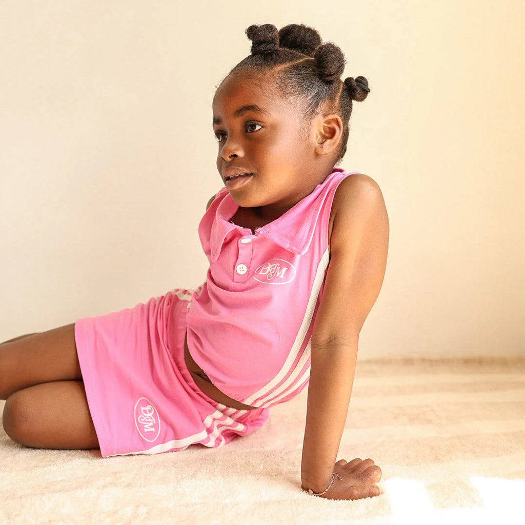 Our Court Set brings all the 90s tennis club energy — a sleeveless top paired with a matching skirt made for twirls, chaos, and court-side cuteness.