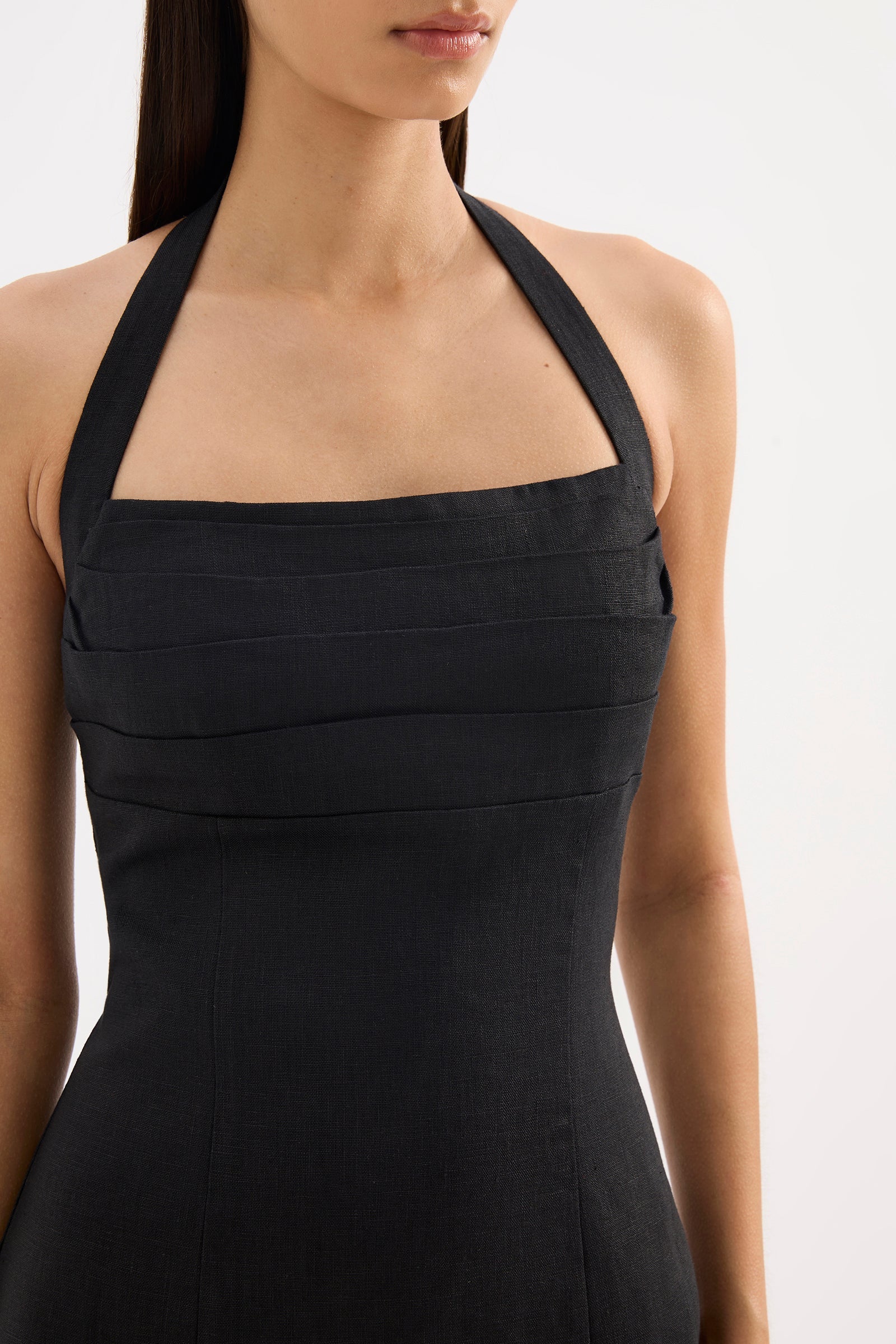The Reyes Linen Mini Dress is made from a breathable 100% Linen that has been washed for a soft, breathable hand feel. This silhouette is slim fitting with an A-line mini skirt. Features include halterneck straps, tucks through the bust and a centre back invisible zipper. This dress is fully lined.