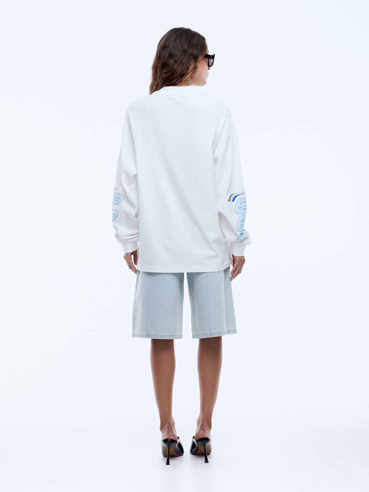 The Team Pelly Long Sleeve Tee is crafted from soft cotton with an oversized long-sleeve cut in vintage white. Finished with fresh, colourful water based graphics inspired by vintage Ena Pelly artwork.