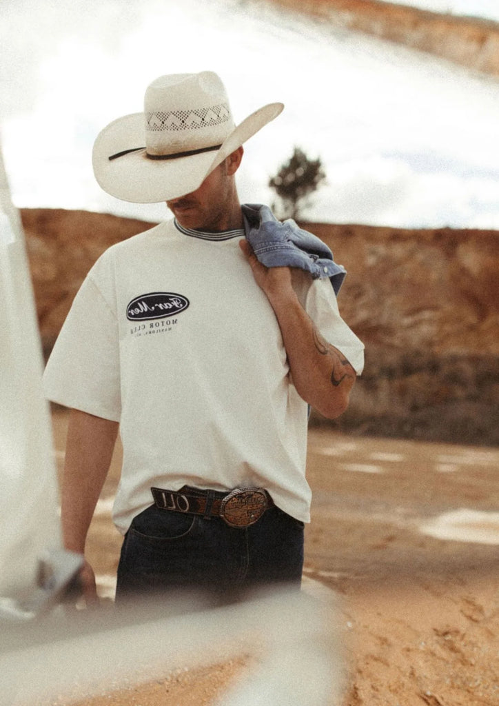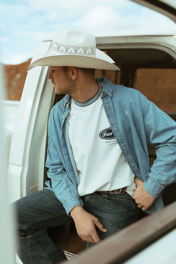 Classic white with navy accents — a nod to iconic vintage Ford Motorcars. This unisex box tee features contrast neck ribbing and a clean silhouette, built for easy wear across seasons. The design channels old-school motor club energy with a FAR MER twist: understated, iconic, and ready to ride.