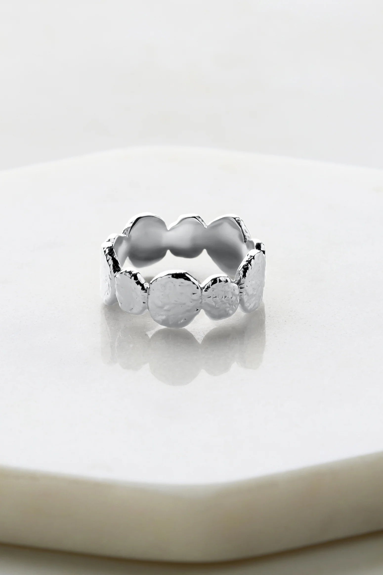 A stunning handcrafted piece from our Artisan Range. Featuring a unique hammered texture and luxurious Silver Rhodium 2-micron plating, this ring is a true testament to refined craftsmanship and timeless elegance. Whether worn solo or stacked, the Chloe Ring adds distinctive sophistication and artistry to any look, making it the perfect statement piece.