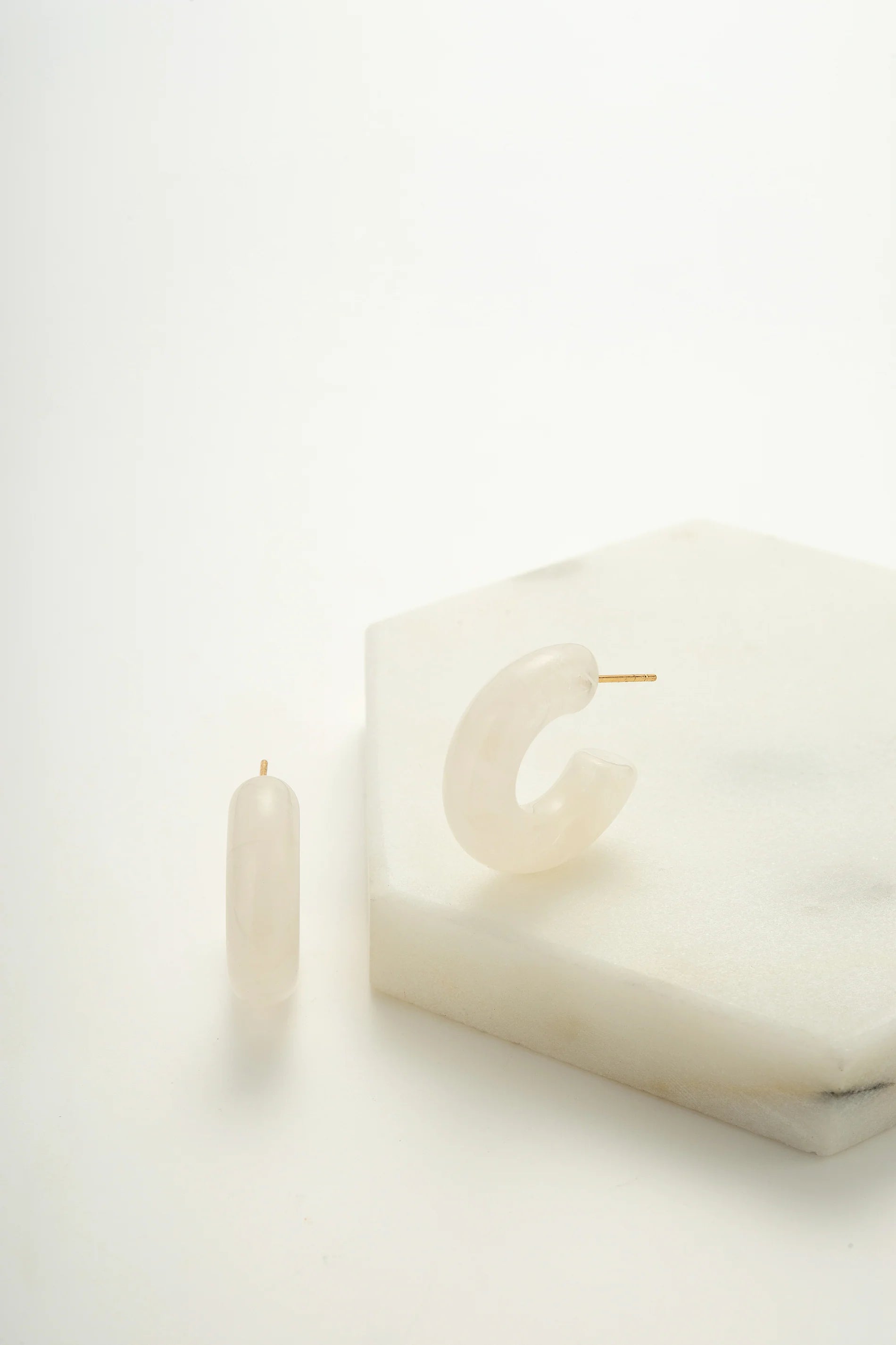 The Carla Earrings are resin white hoops, offering a chic and breezy vibe, making them the perfect accessory for summer days. Made Nickel Free Hypoallergenic brass metal 18k Gold Plated Earring Size is 10mm (W) x 25mm (L) Measured at the widest width and overall length Water resistant