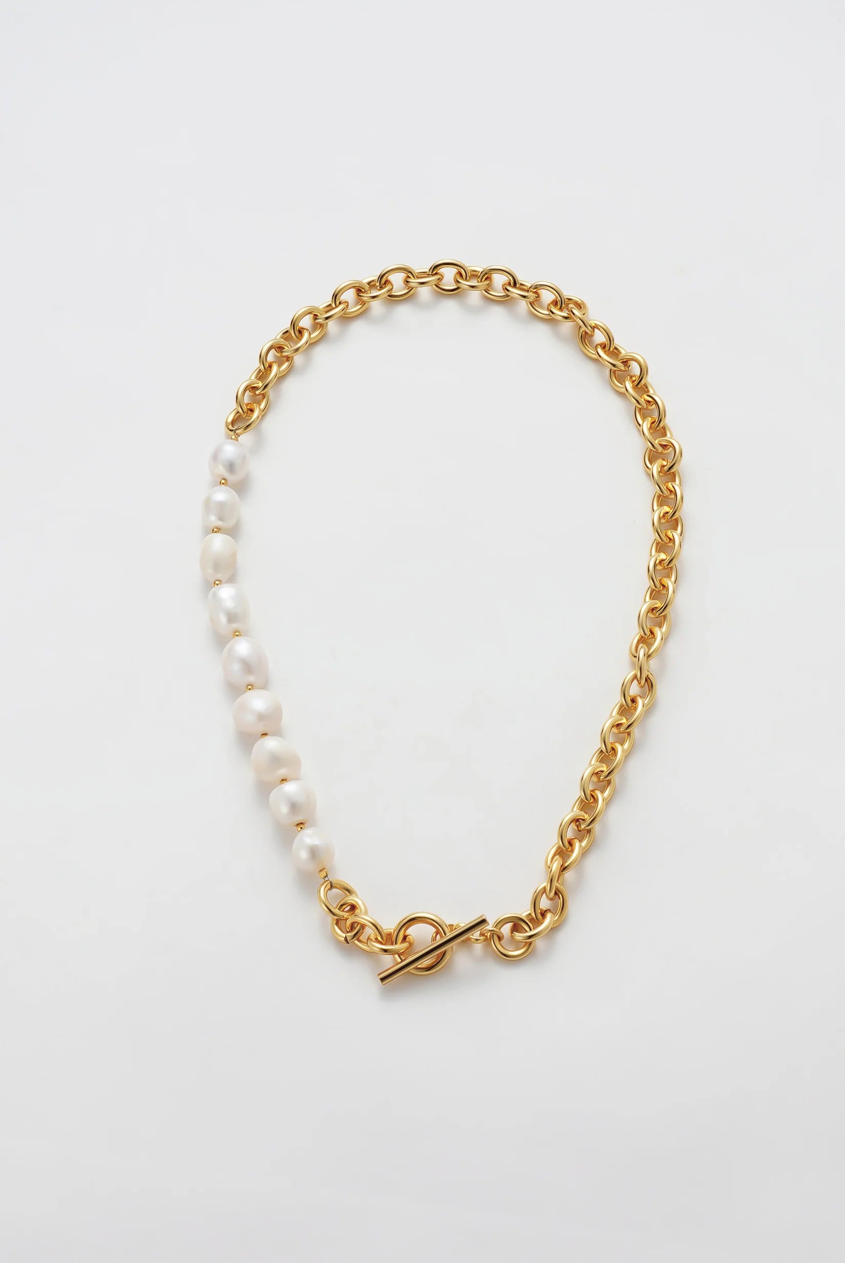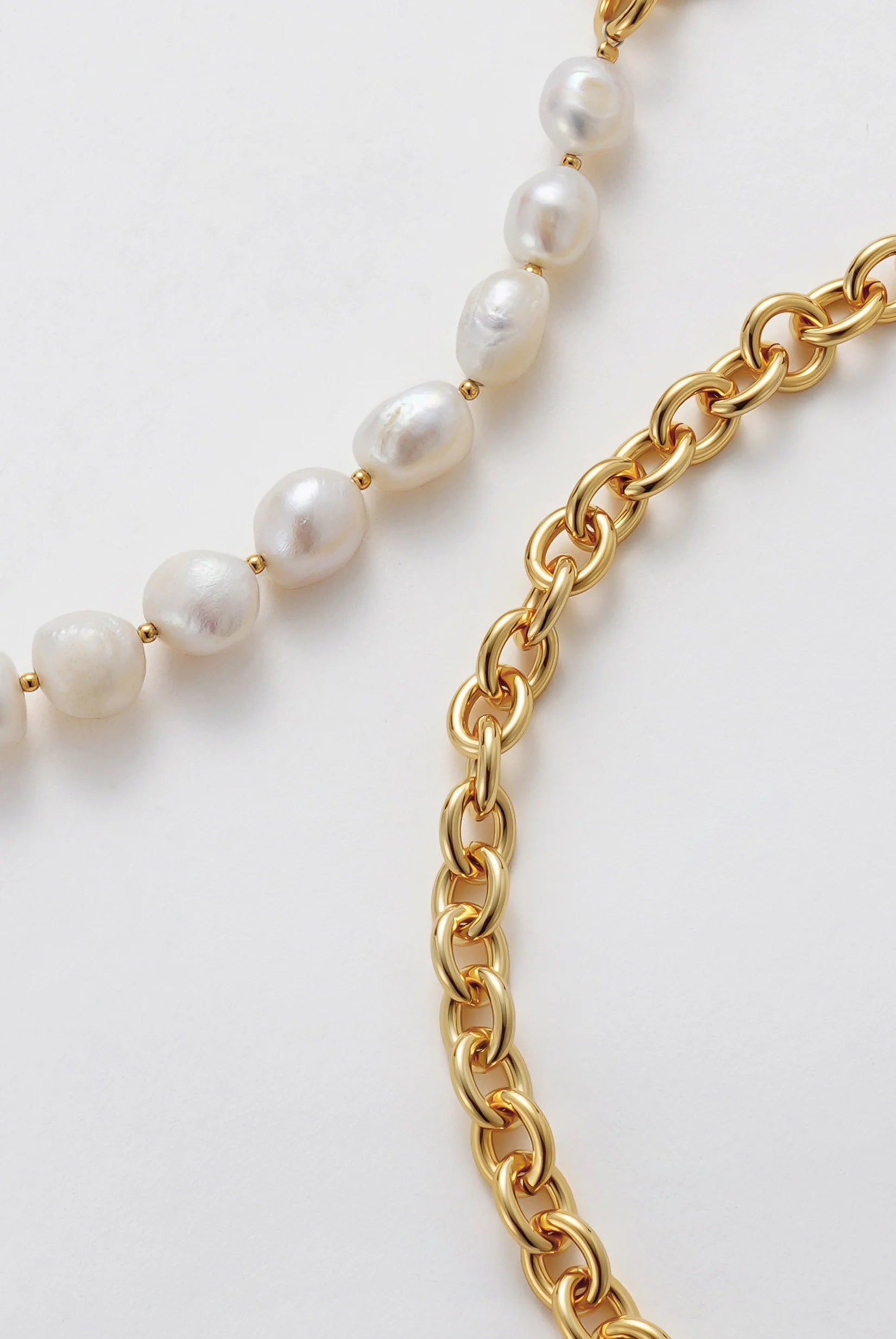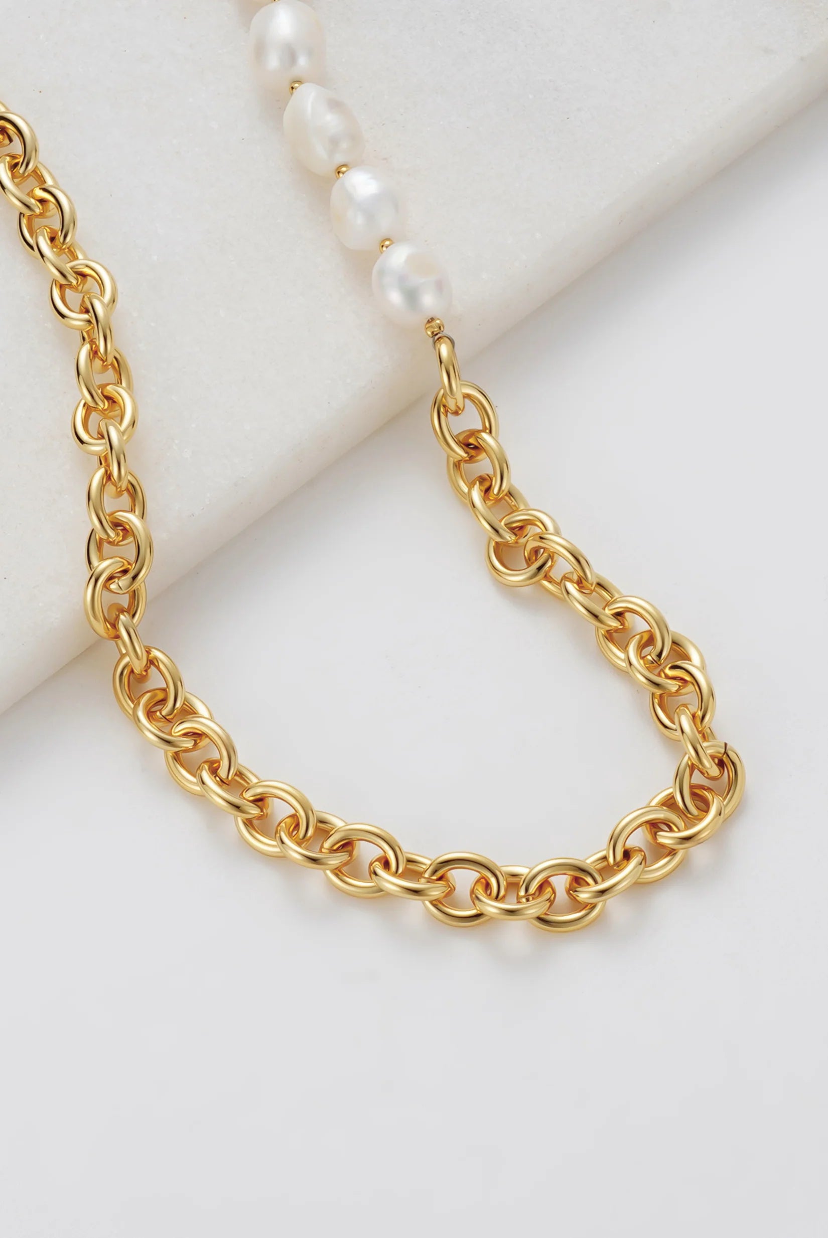 The Eliza Necklace is a modern take on timeless elegance, blending luminous freshwater pearls with bold gold link chain detailing. Finished with a classic fob clasp, this design adds a touch of sophistication while allowing effortless wear. Whether layered with delicate chains or styled solo as a statement piece, Eliza transitions seamlessly from day to night.