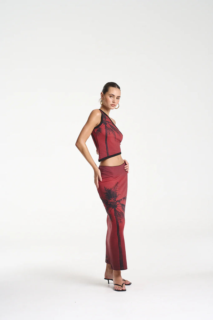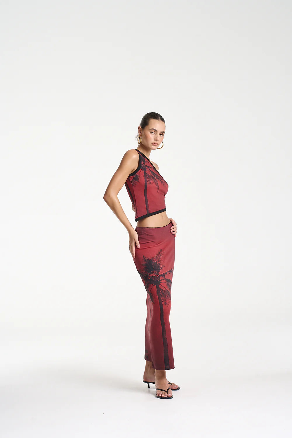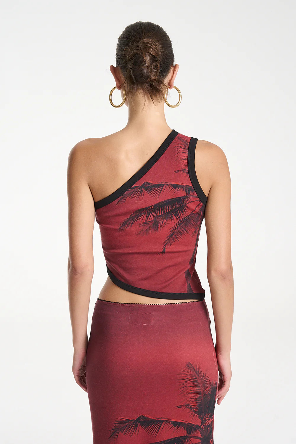 The Asym Singlet featuring the La Palma as a placement print fits seamless across one shoulder and finishes in an asymmetrical crop to accentuate the feminine form. Made from a firm stretchy cotton and trimmed with a solid black border for an elevated look.