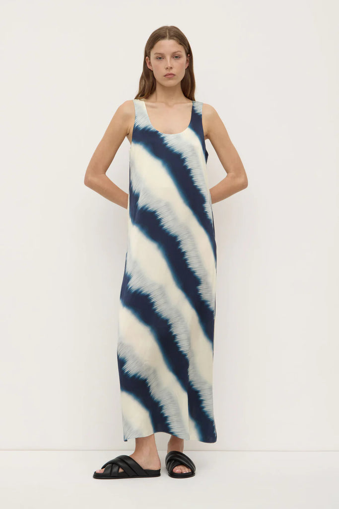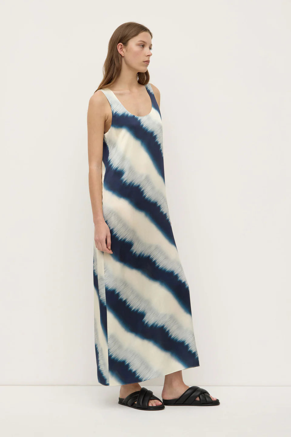 Crafted from a premium satin silk, this maxi dress features a statement tie dye print. Cut for a relaxed silhouette, it offers a gentle drape on the body.