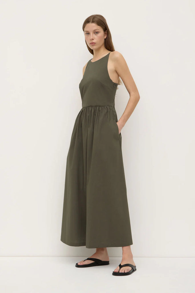 Crafted from our signature cotton poplin, this sleeveless midi dress is designed for day-to-night wear, featuring a fitted bodice and ankle-length skirt with side pockets for added utility.