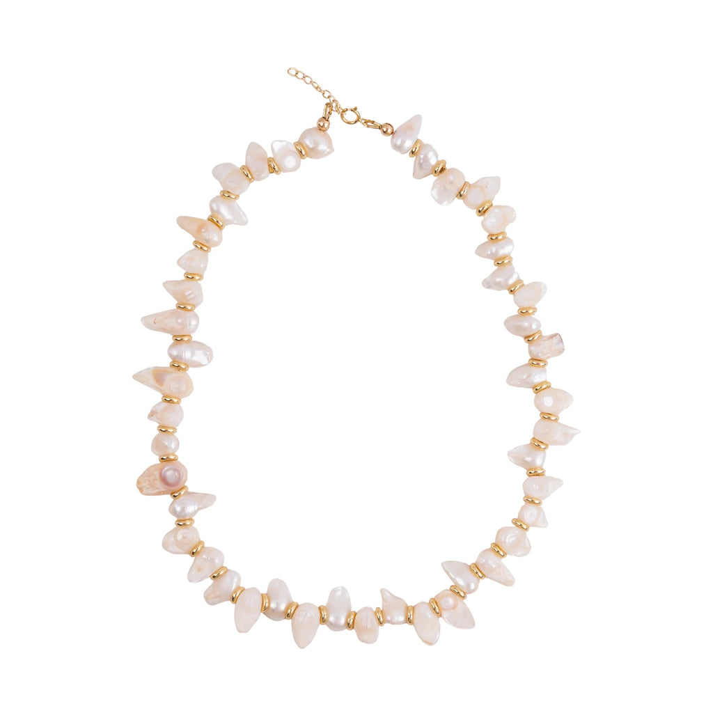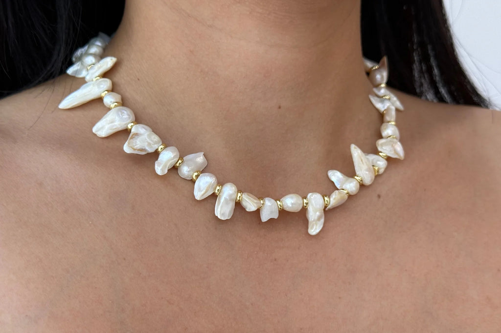 Unique handcrafted necklace with chunky blister pearls and 14k gold filled hardware.