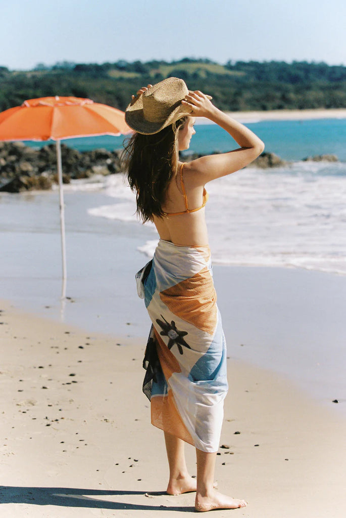 Lightweight and effortless, our Starfish Sarong is crafted from 100% GOTS-certified organic cotton voile and finished with a hand-rolled edge that speaks to artisanal detail. Its design draws inspiration from the natural world, vintage starfish motifs and hand-painted textures in black, orange, blue, and cream echo the layered beauty of coastal landscapes, creating a sense of depth and quiet movement across the fabric.