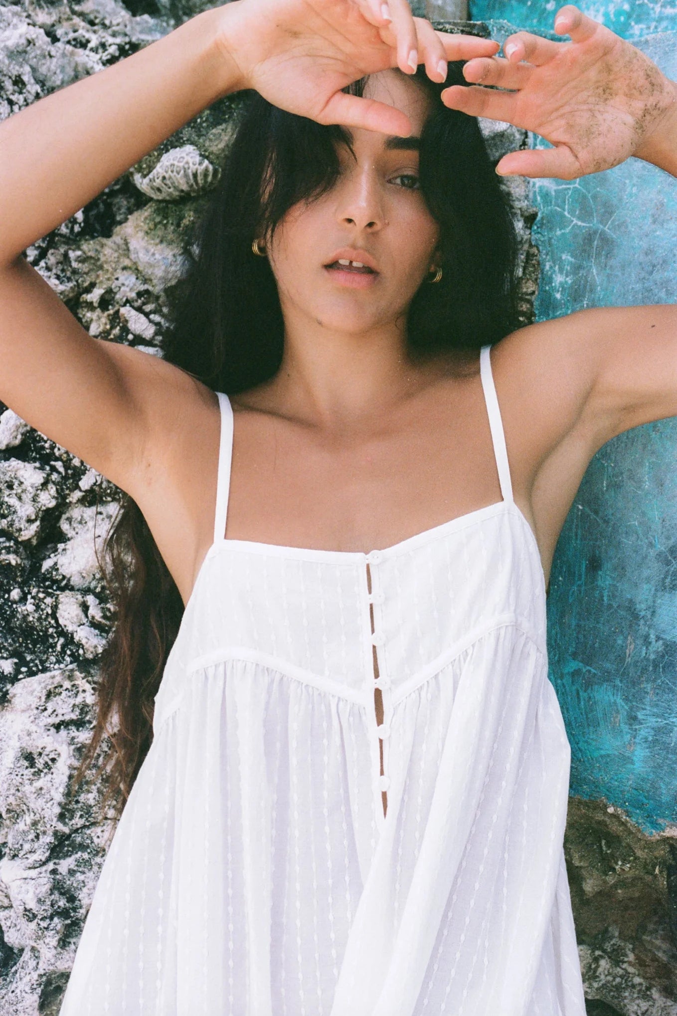 BEATRICE Cotton Dress - your dreamy, throw on and go cotton midi dress with just the right amount of detail. Made from soft, lightweight 100% cotton with all-over embroidery, she’s floaty, breathable, and made for long summer days. Featuring adjustable straps, front corozo buttons and a relaxed fit that’s bra and curvy-bust friendly, Beatrice is easy to wear and easy to love.