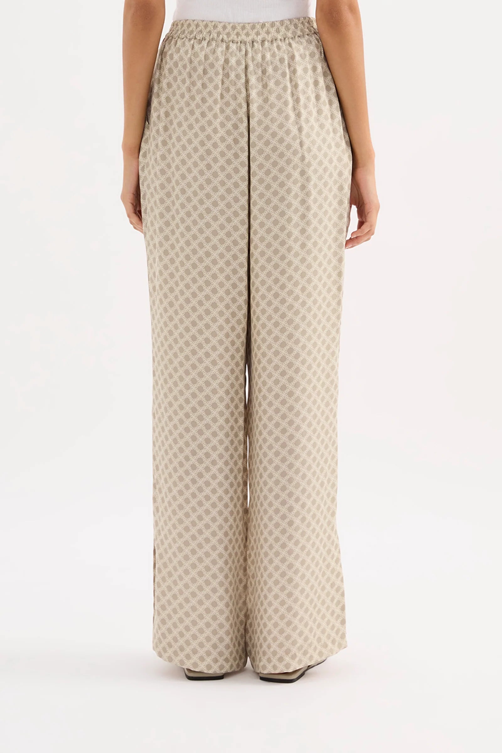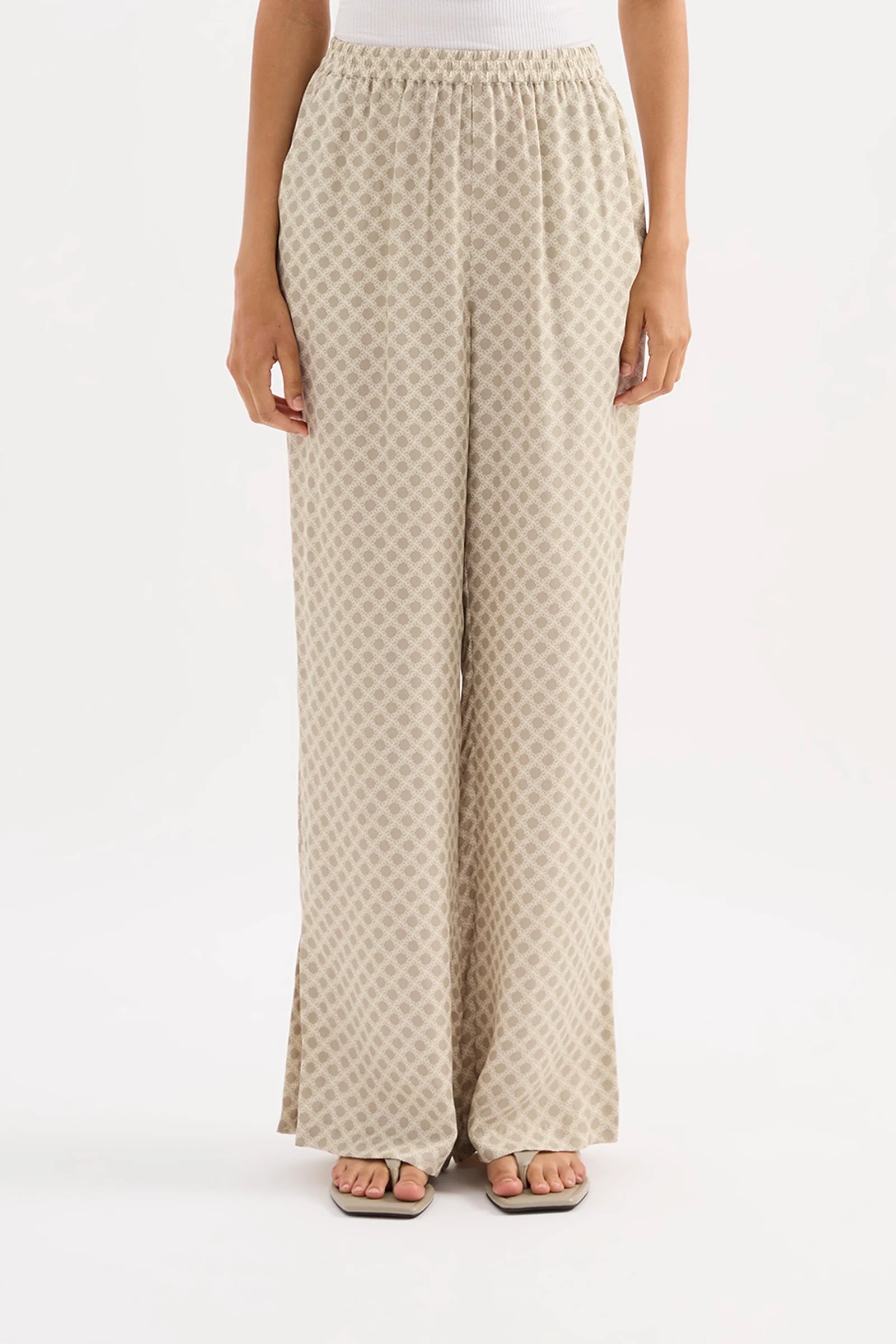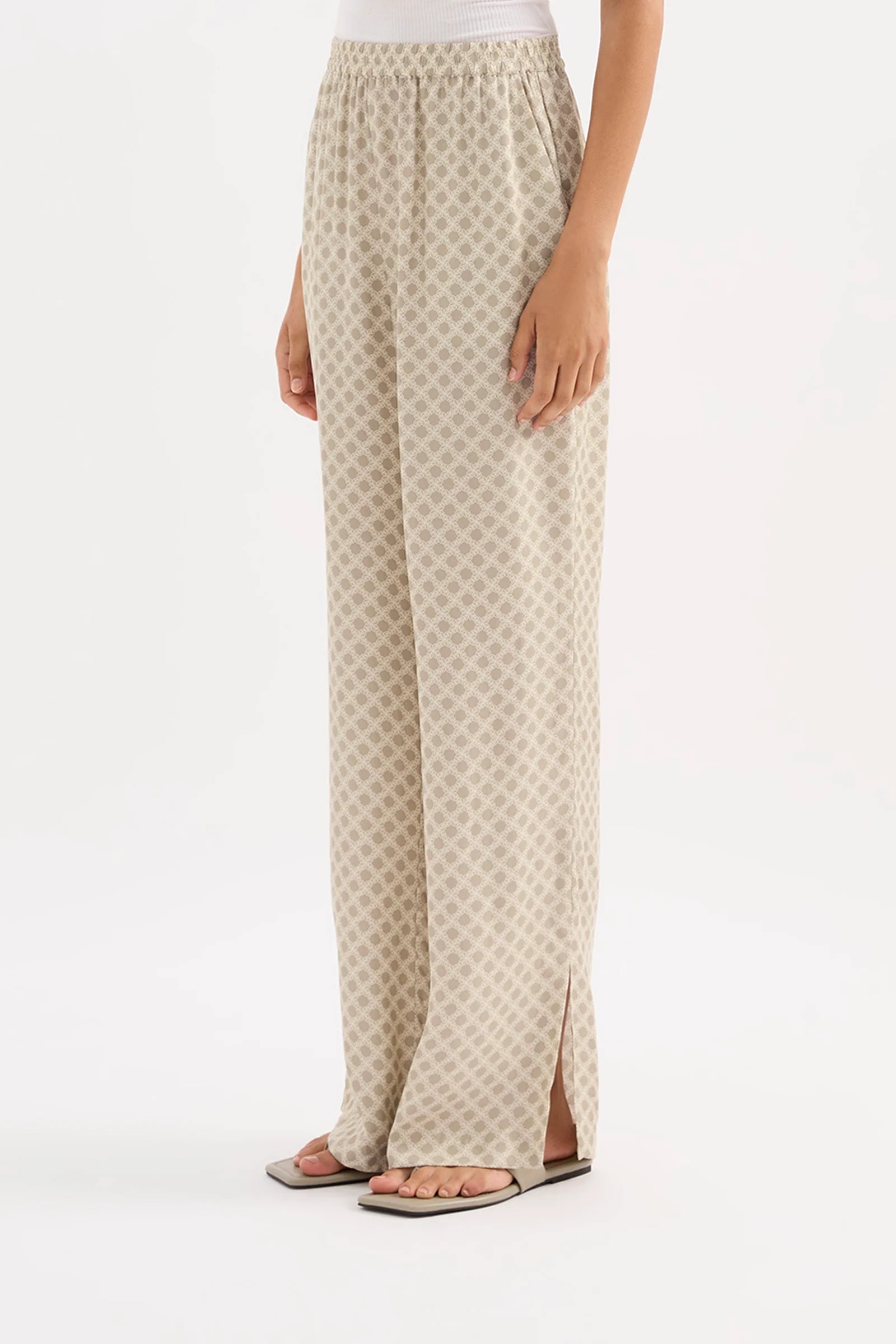The Cosmos Cupro Pant is made in our signature cupro fabrication in our exclusive Cosmos print. The silhouette is a relaxed wide leg, full length pant. Features include an elasticated waistband, side seam pockets and slits at hem.