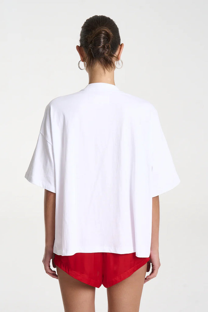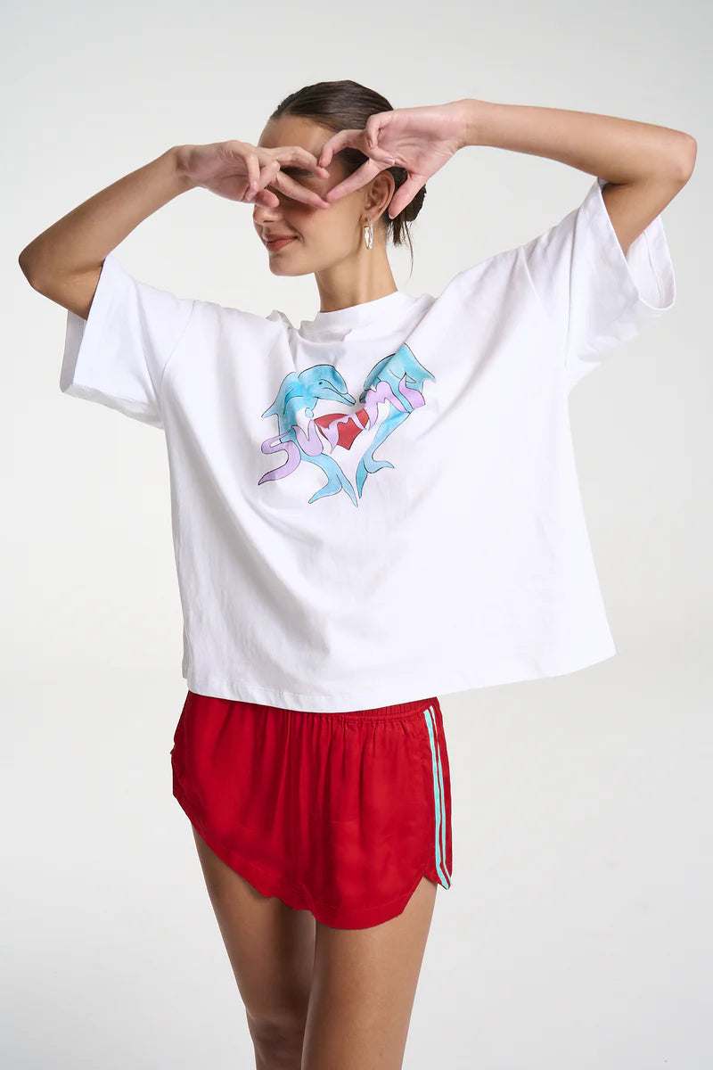 This timeless tee offers a slightly cropped and relaxed fit, highlighted by the hand-painted TROPPO DOLPHINS artwork and SUMMI text.