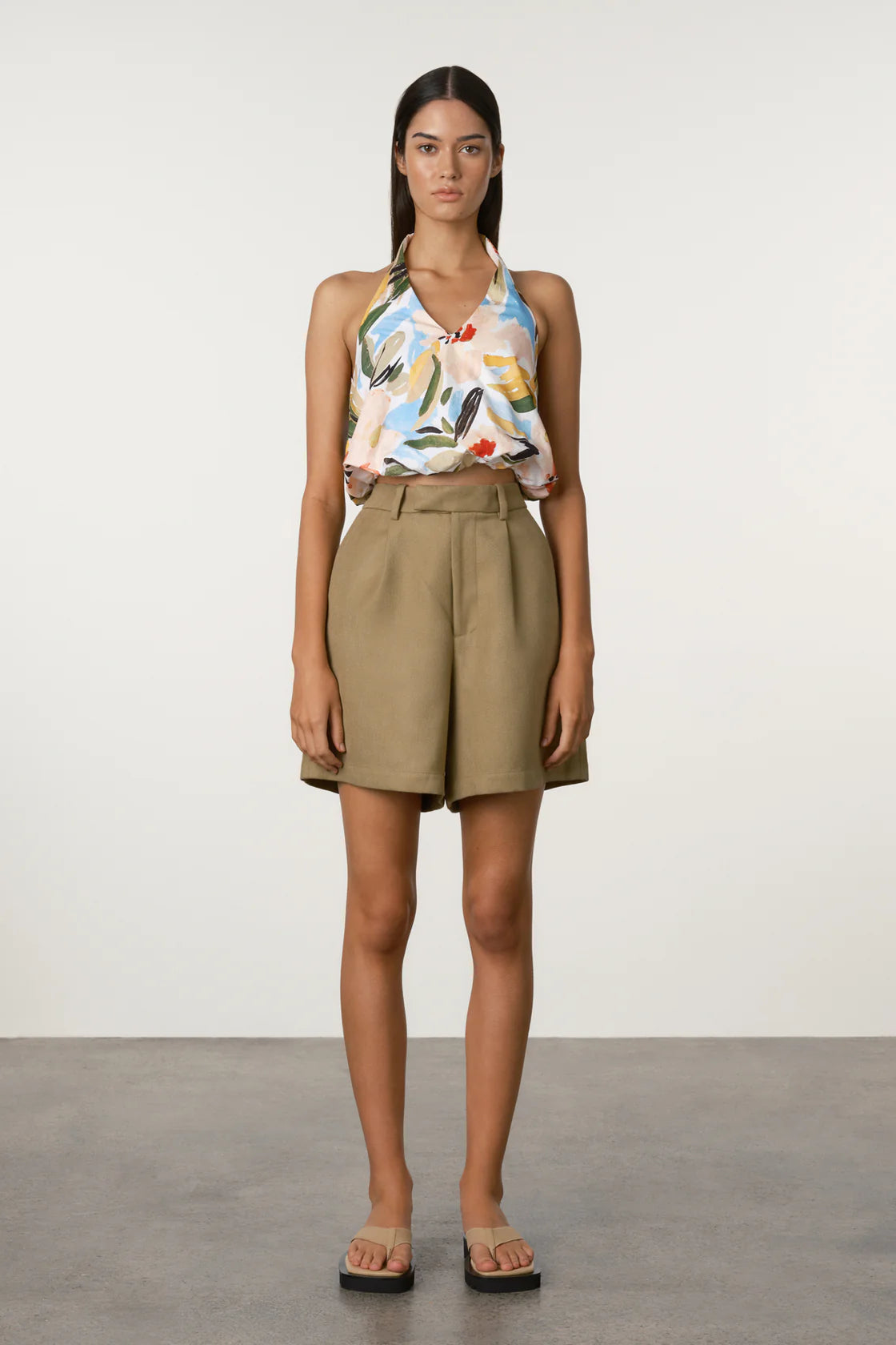 Effortlessly and feminine, this halter features a soft sandwashed finish and a custom hand-painted floral print. It features a V-neckline and a voluminous, gathered bodice in a cropped length. The halter is finished with an elasticated hem and lined in structured cotton poplin to hold its shape. Pair with the Summer Floral Cotton Pant—perfect for easy summer days.
