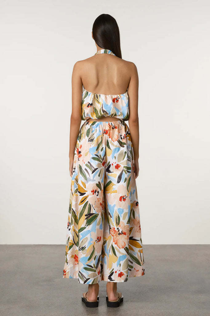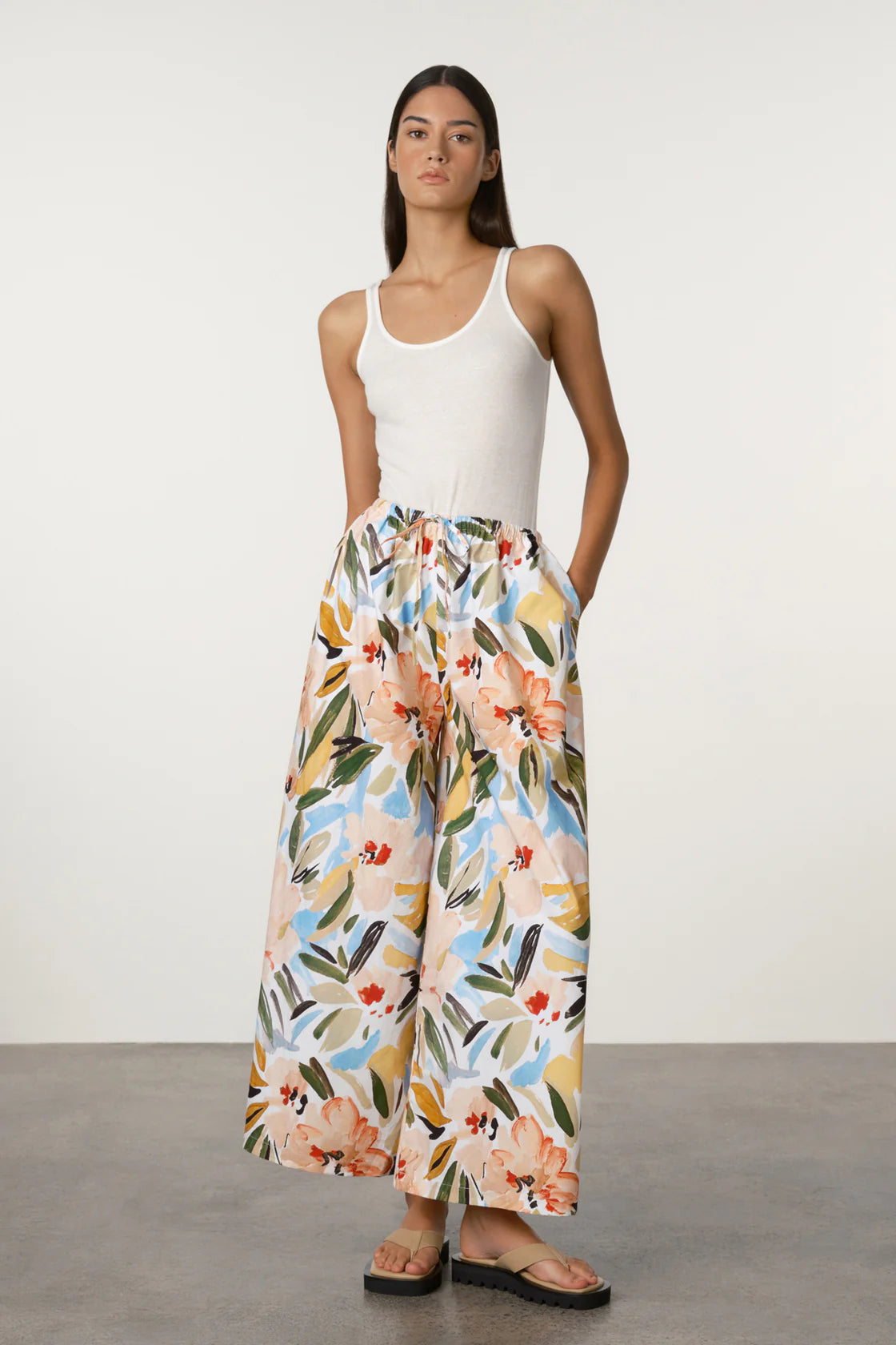 Breezy and effortless, these pants feature a soft sandwashed finish and a custom hand-painted floral print. Designed with a relaxed wide-leg fit, elastic waistband, and self-fabric drawcord for comfort. Side seam pockets add functionality—perfect for easy summer days.