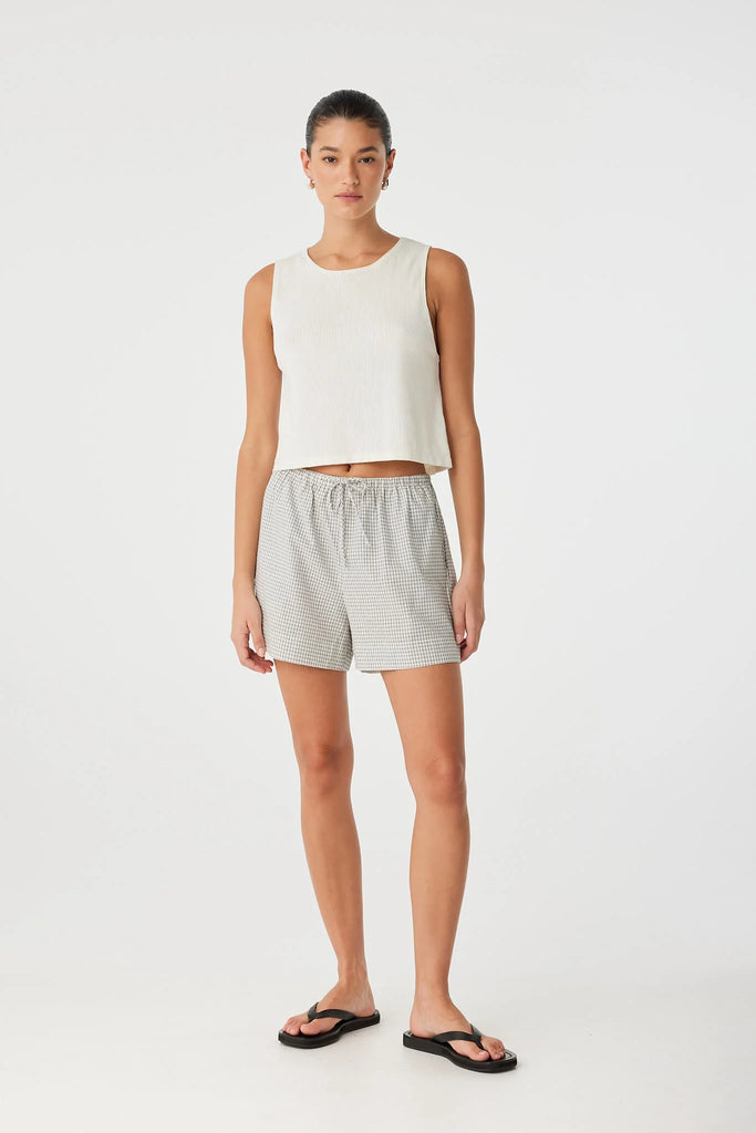 Relaxed drawstring shorts in lightweight cotton check, designed for warm-weather ease. Featuring side seam pockets and soft, breathable structure for all-day comfort.