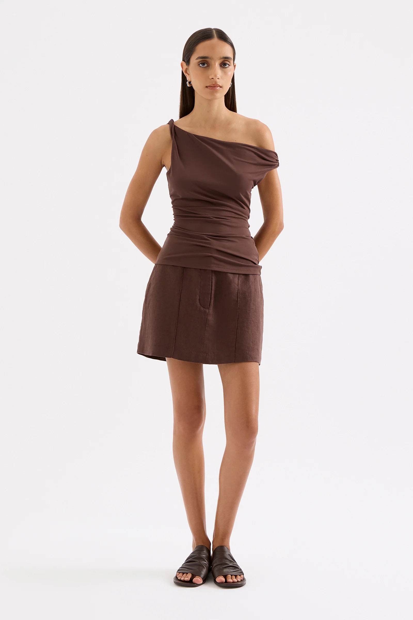 The Theo Linen Skirt is made from 100% linen fabrication with a breathable, soft hand feel. This skirt is mini length and has a high-rise fit. It features a front fly closure and side seam pockets.