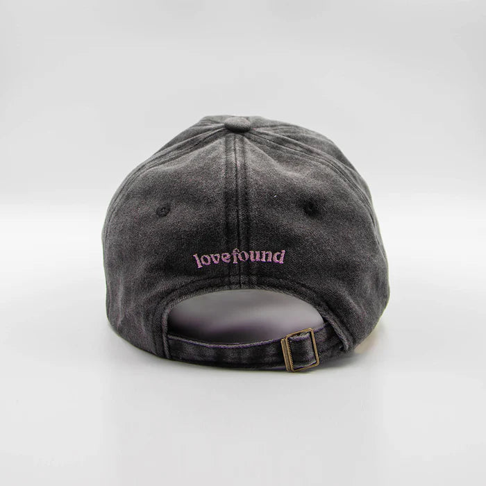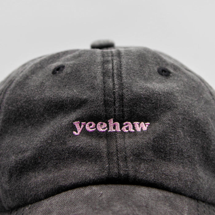 All caps feature a pale-pink embroidered 'yeehaw' slogan on the front and 'lovefound' embroidery on the back.