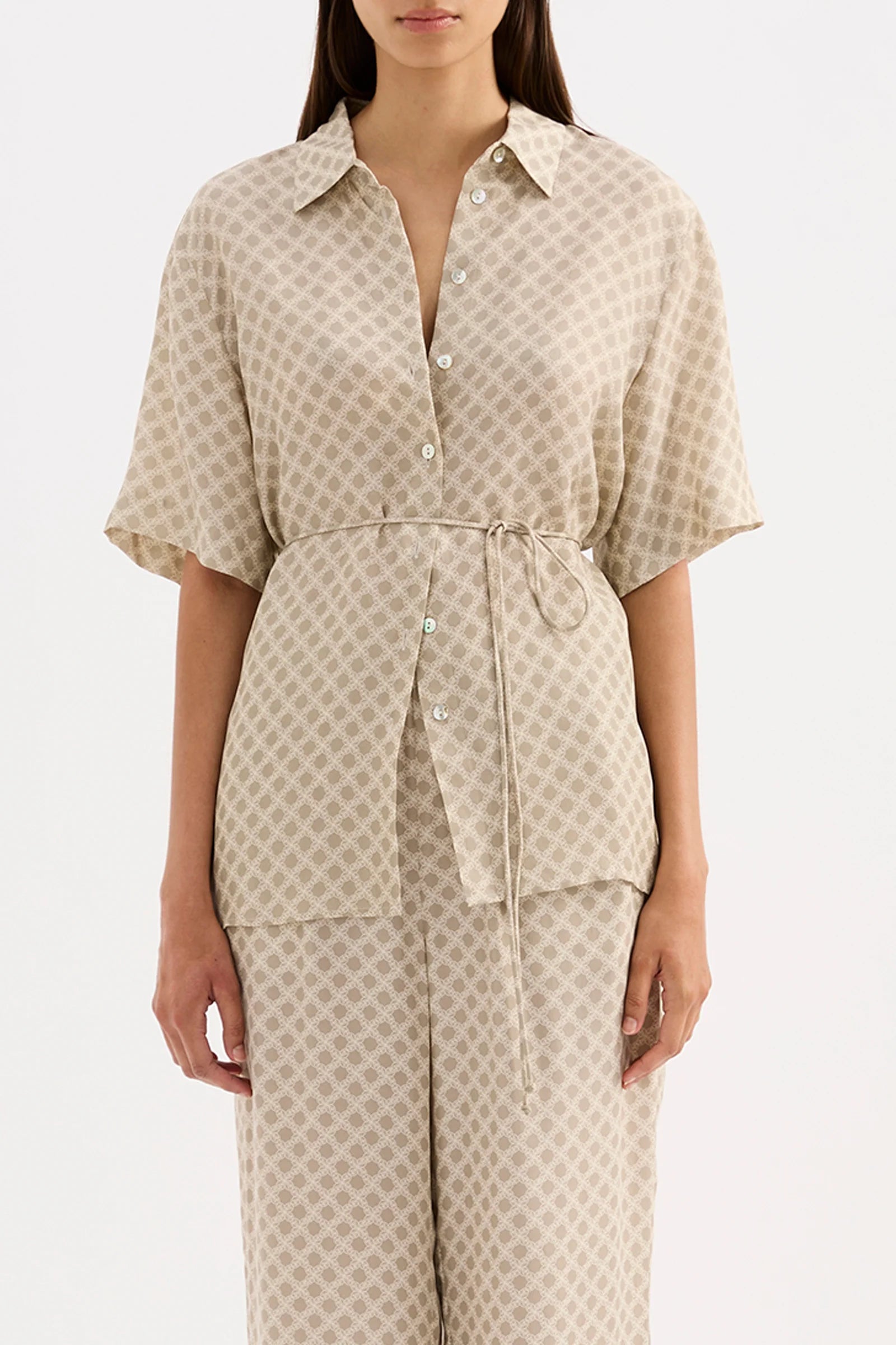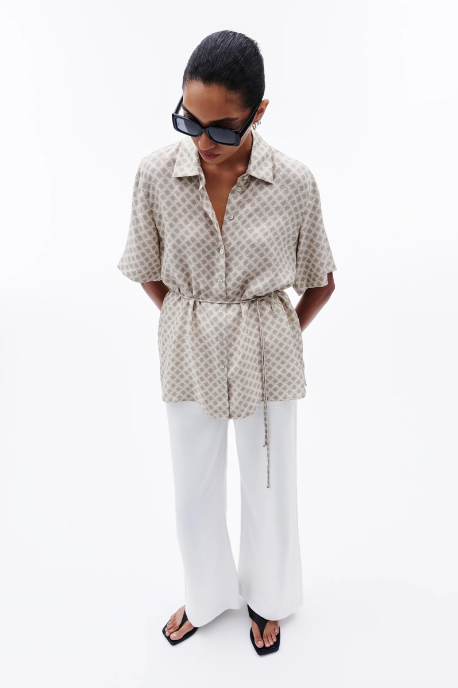 The Cosmos Cupro Shirt is made in our signature cupro fabrication in our exclusive Cosmos print. The silhouette is an oversized fit, with length finishing at the hip. Features include classic shirting details, back yoke, thin rouleau waist tie and shell buttons.
