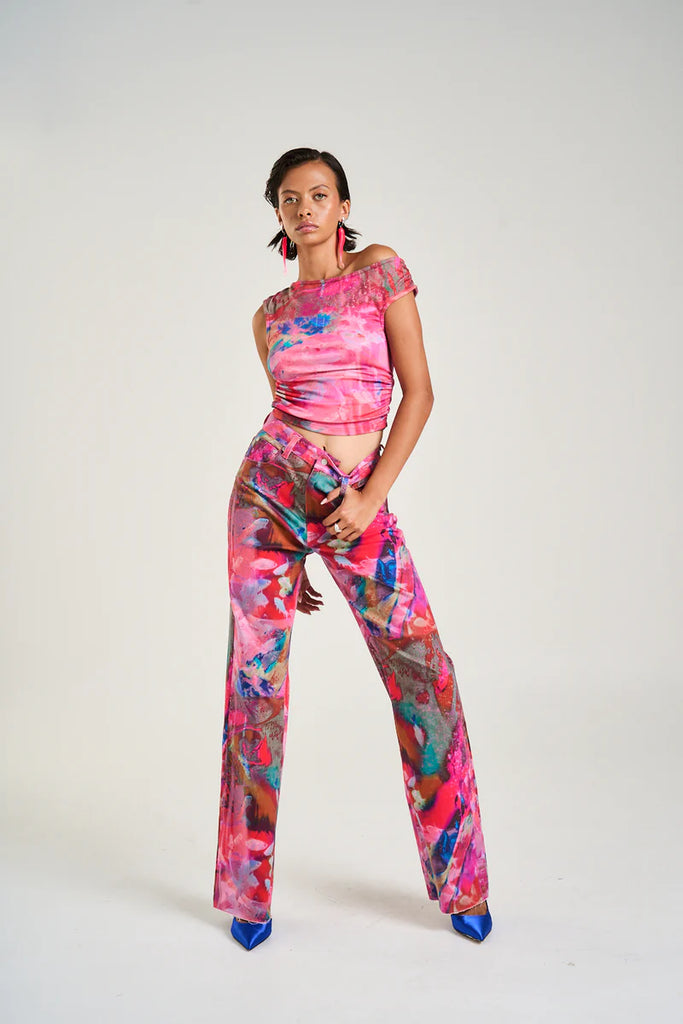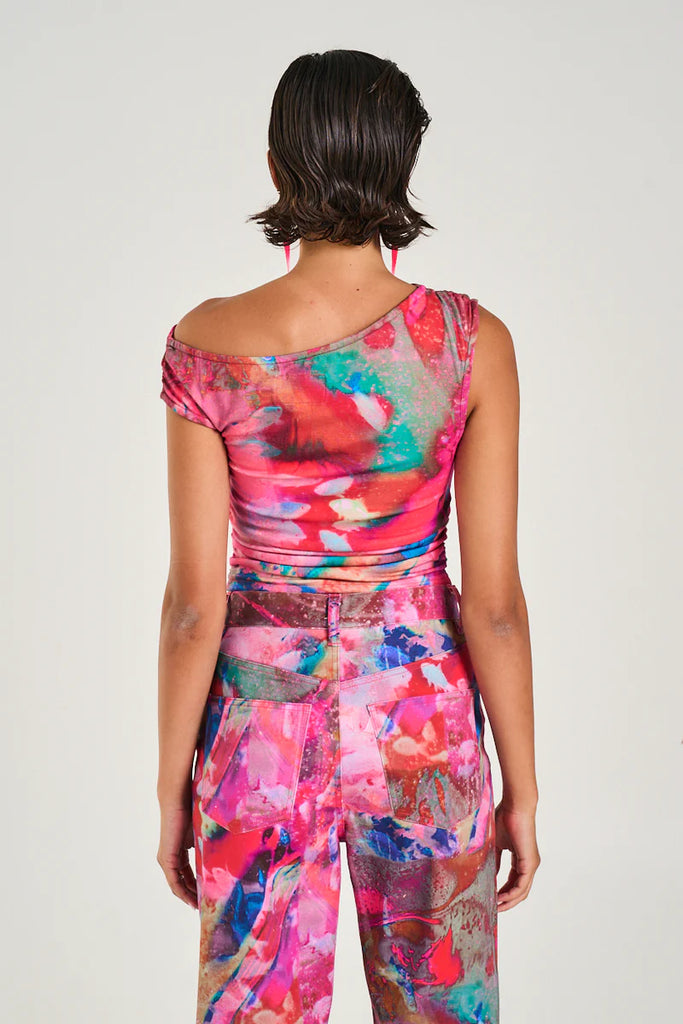The Off Shoulder Tank in the striking Fish Tank print has been constructed from a stretchy rayon blend, featuring a ruched midsection for a flattering fit.