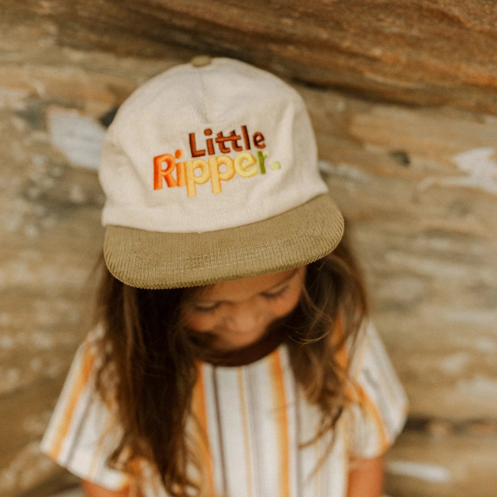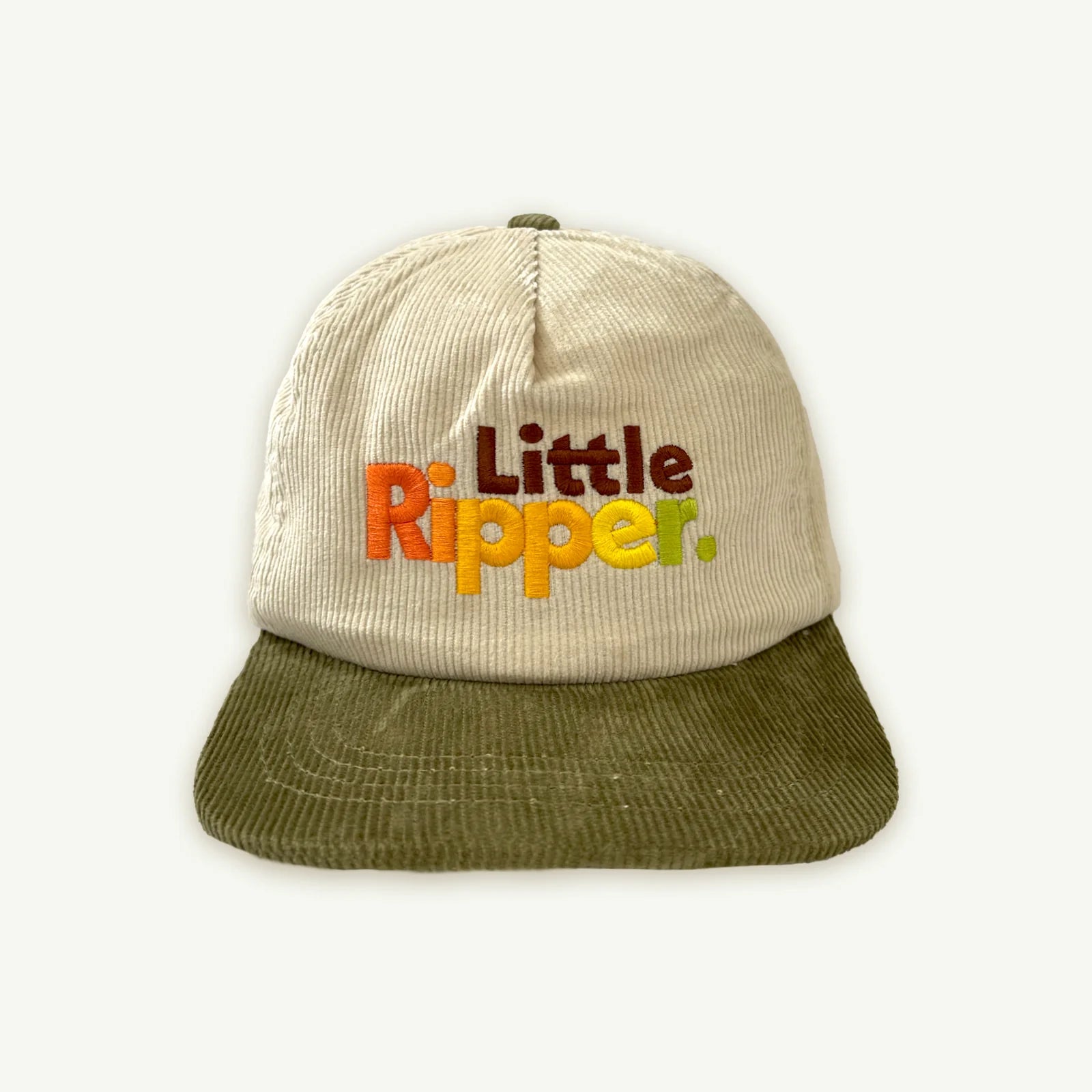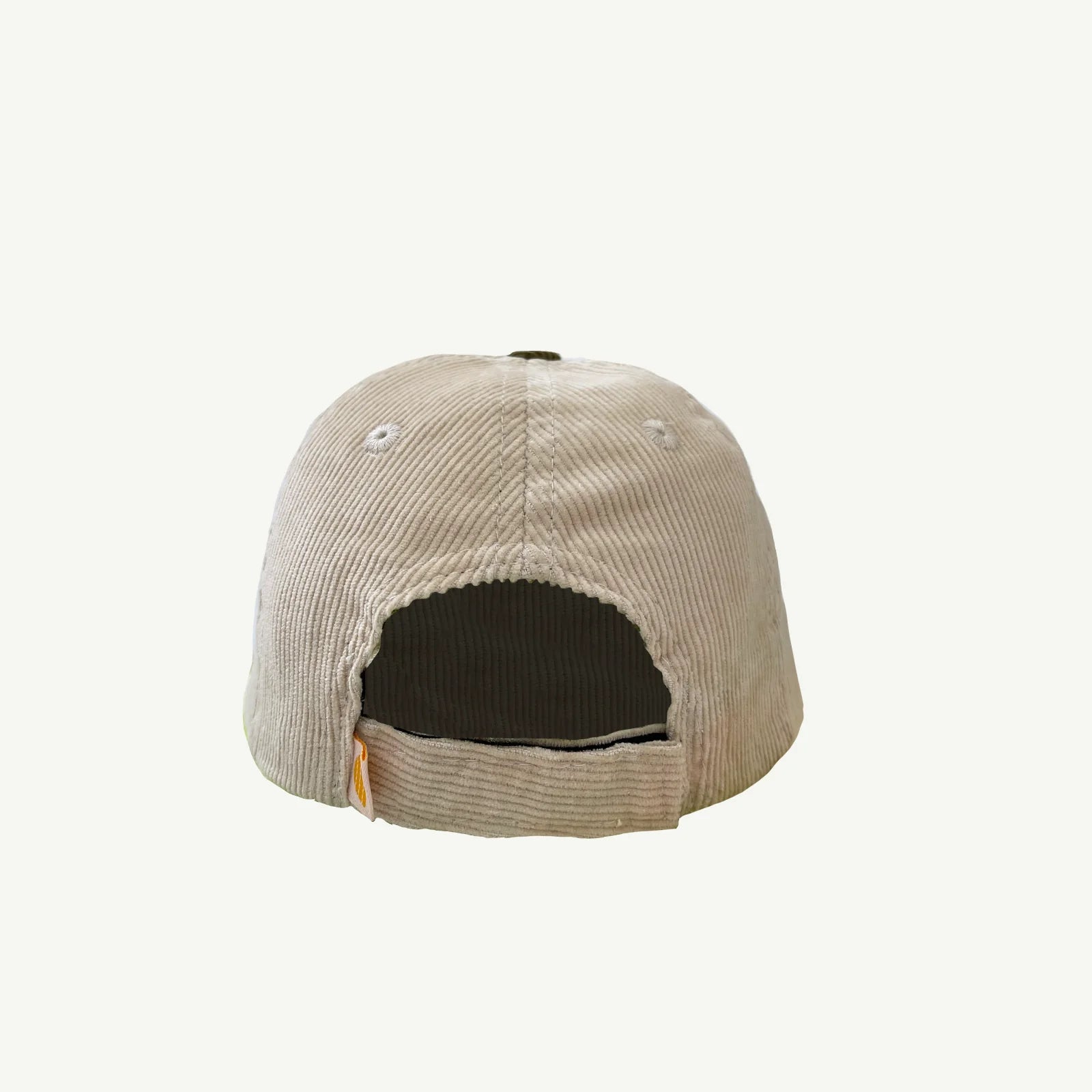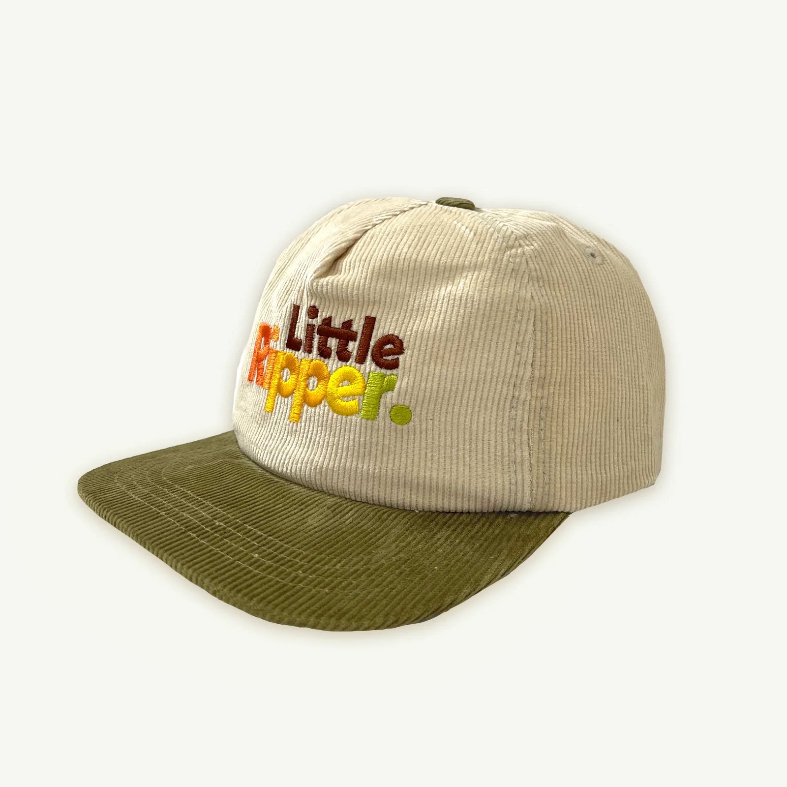 This retro surf inspired logo in bursting citrus colours is embroidered onto a natural coloured cord with contrast army coloured brim. Match Dad or Mum in the 'Ripper' cord cap.