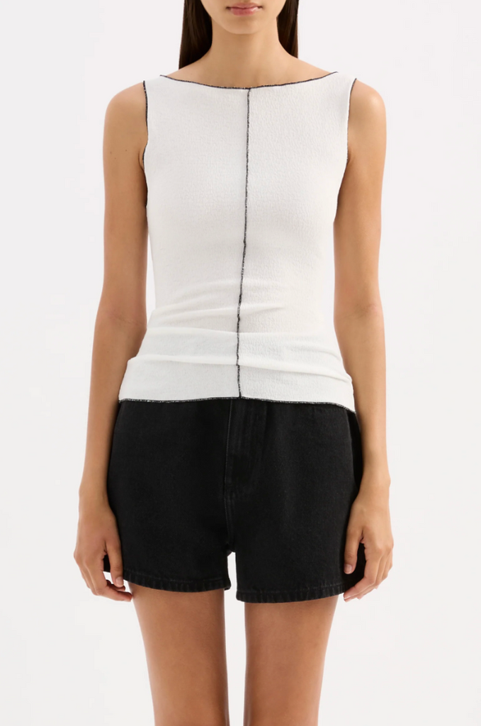 The Hilda Tank is made from a lightweight textured jersey that is stretchy and soft on the skin. The silhouette is slim fitting with a boat neck and length sitting at hip level. Features include contrasting baby locked edges.