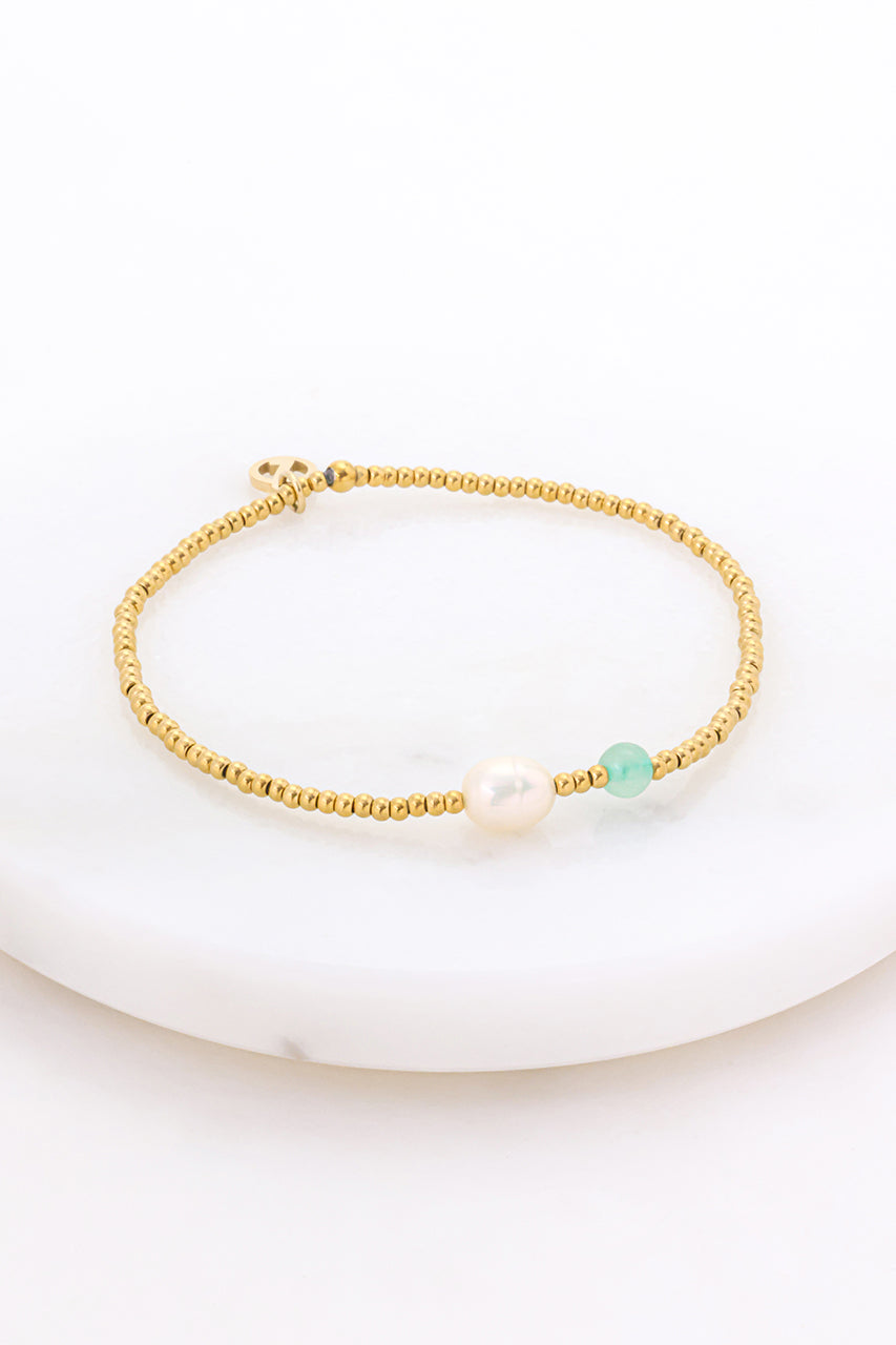 Elegant gold bracelet with sea-inspired semi-precious stones and freshwater pearls for a natural touch.