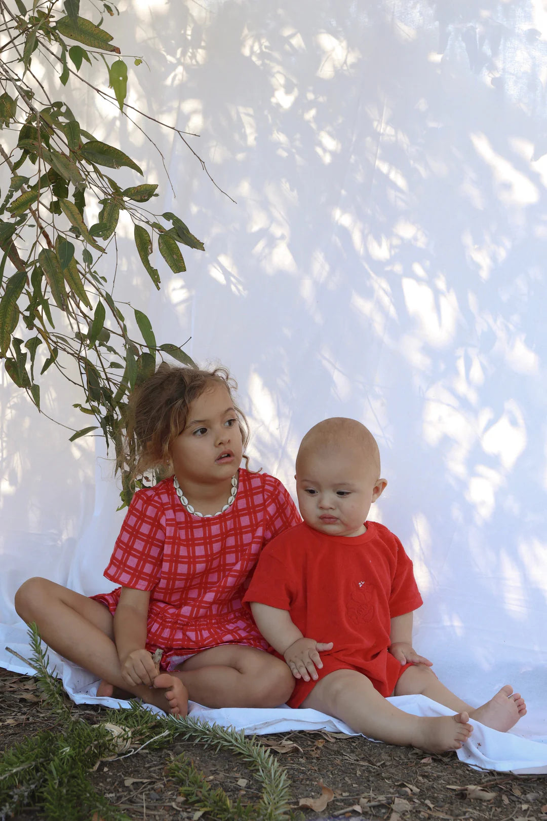 Terry towelling playsuit featuring our Shawn the Prawn design on the front. Functional press snaps at crotch for easy nappy changes and press snaps at shoulders for easy on/off.