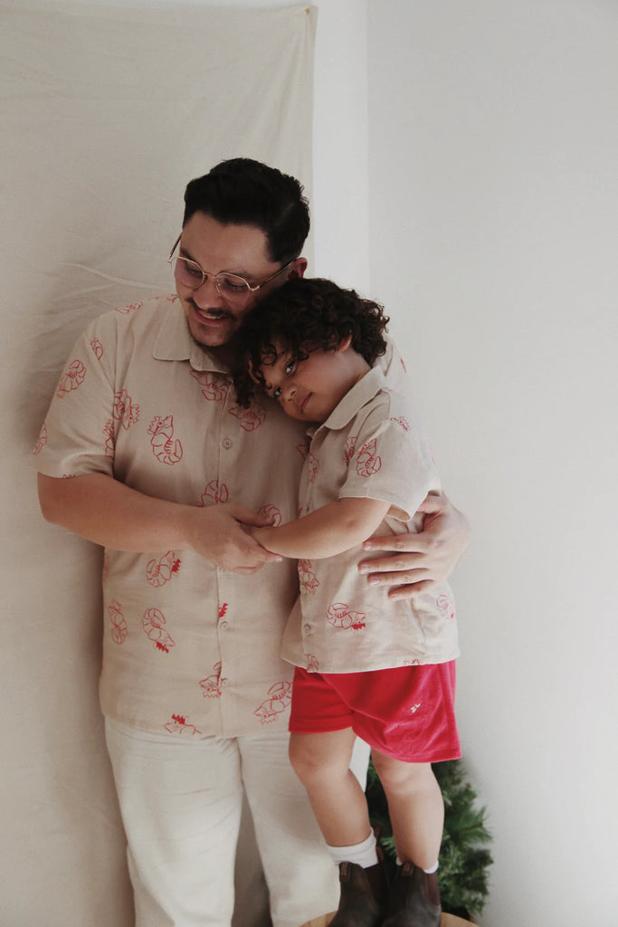 Terry towelling shorts featuring our embroidered Shawn the Prawn design. Elastic waist + functional drawstring. Mix and match with items from our Christmas Collection.