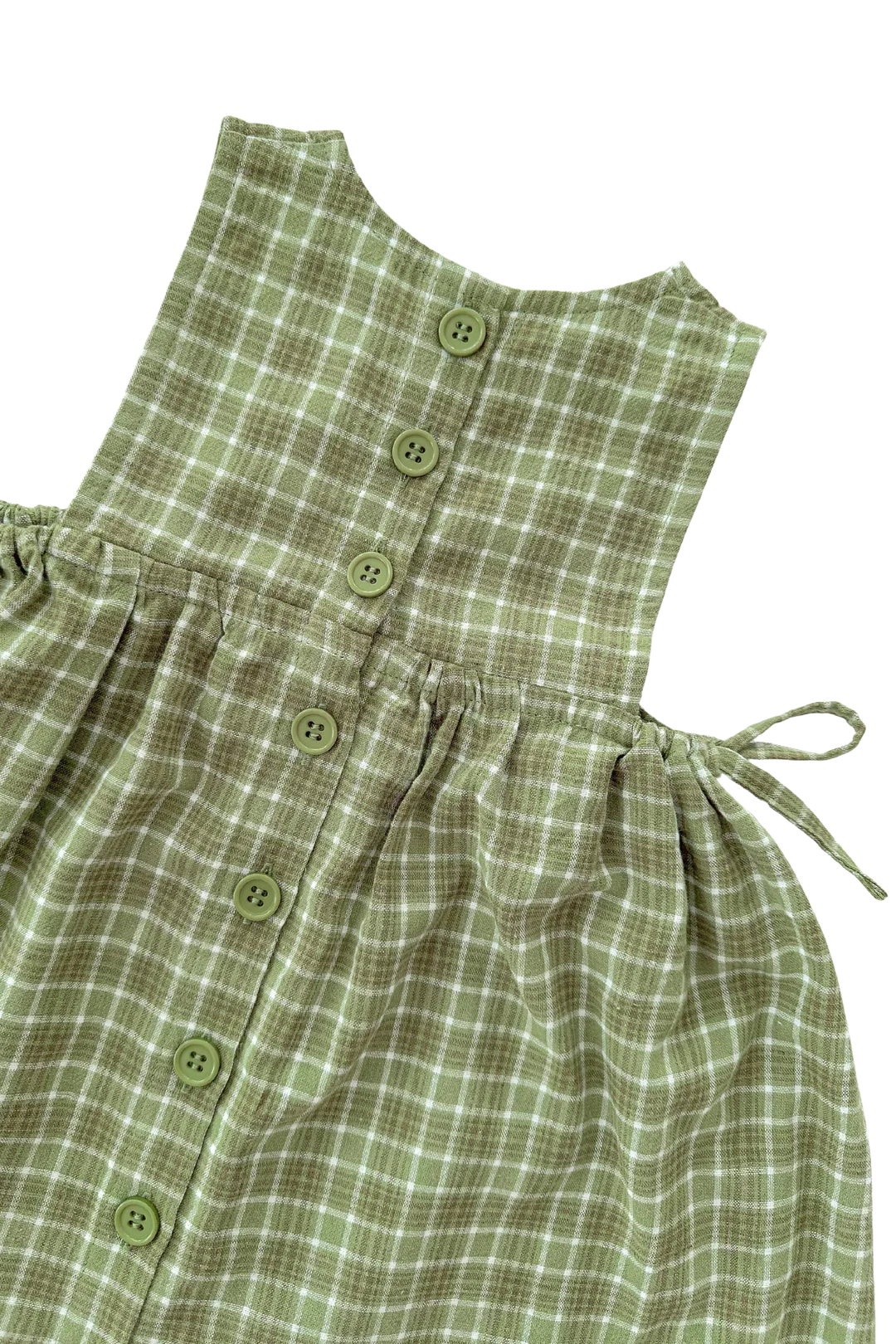 Cotton dress in our beautiful Thyme fabric. Adjustable ties at waist and buttons on the back for easy on/off. Mix and match with items from our Christmas Collection.
