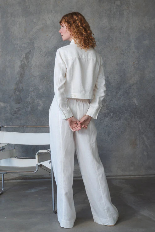 Our MILLY linen jacket is crafted with 100% EUROPEAN FLAX® and features denim jacket inspiration, eco-friendly Corozo nut buttons, front pockets, and French seams. Wear with OLI pants or your favourite jeans.
