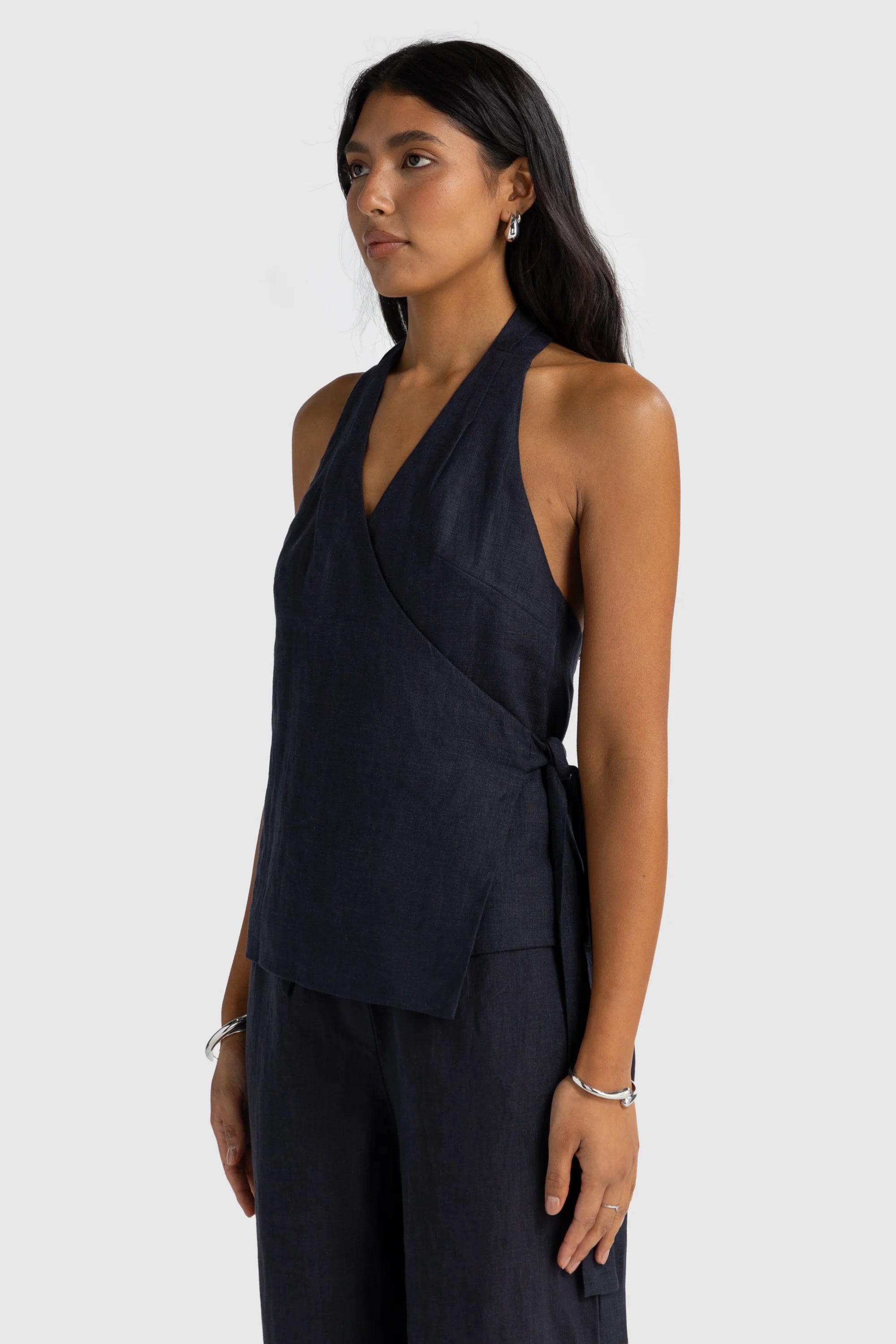 Chic and effortlessly feminine, the Elise Linen Wrap Top is crafted from breathable mid-weight linen. Featuring a halter neckline, plunging front, and open back, it ties at the waist with a matching wrap belt for a flattering fit. Pair it with any of our denim bottoms or linen shorts for a coordinated summer look.