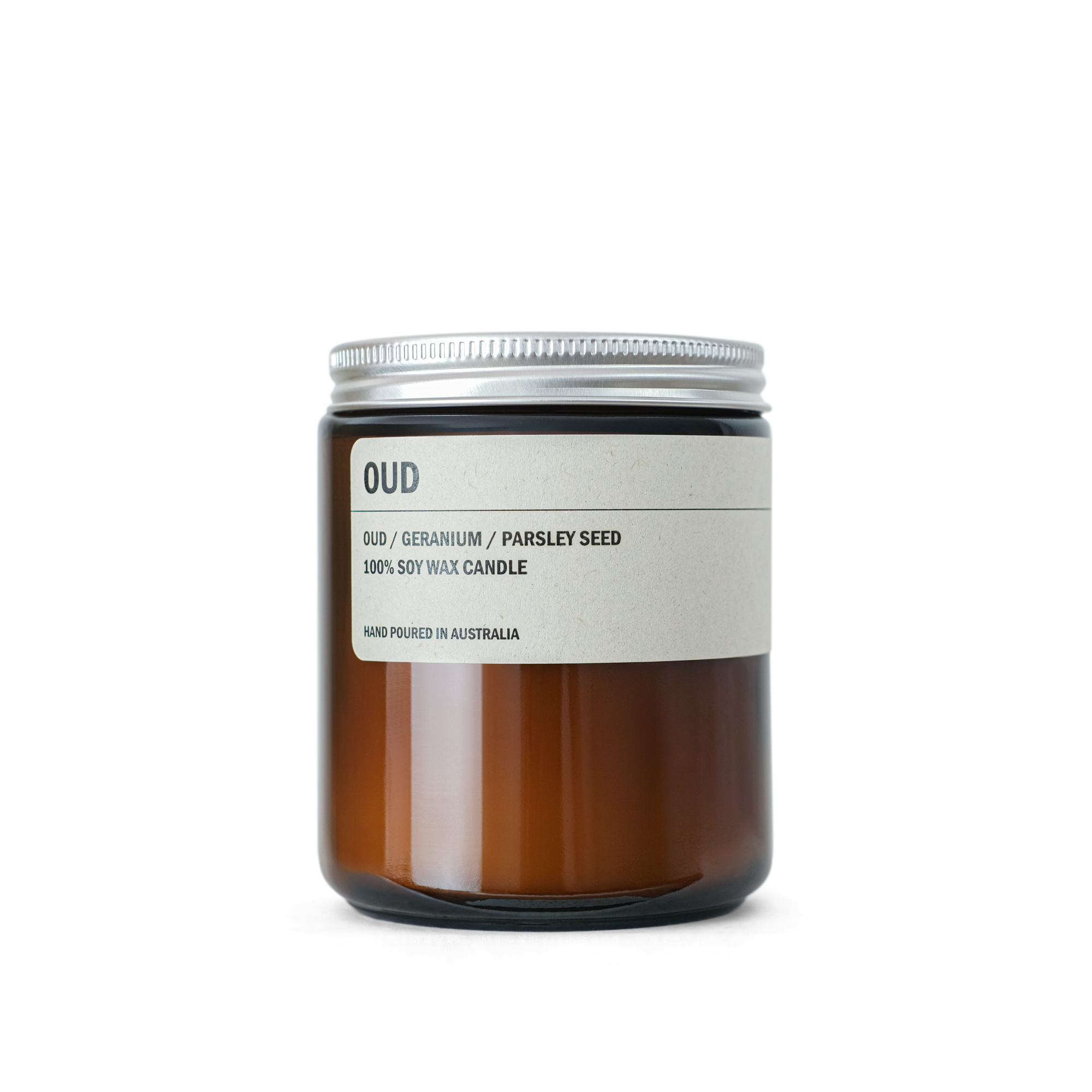 Natural 100% soy wax candle set in an amber glass jar, topped with an aluminium screw top lid.